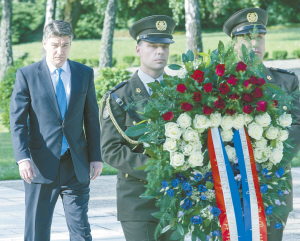 ?、?月9日,在克羅地亞首都薩格勒布,克總理米拉諾維奇(左)在紀(jì)念反法西斯戰(zhàn)爭勝利70周年的活動(dòng)中向人民英雄紀(jì)念碑敬獻(xiàn)花圈。新華社發(fā)