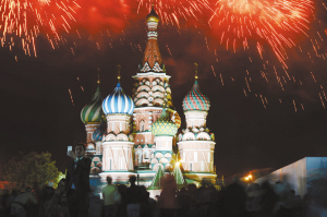 ①5月9日,禮花在俄羅斯首都莫斯科紅場上空綻放。