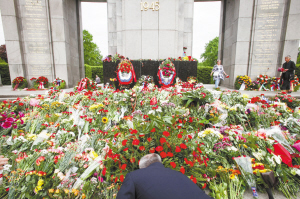 ?、?月9日,一名男子在德國柏林一處蘇軍烈士墓獻(xiàn)花。