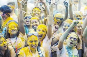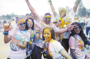 當(dāng)?shù)貢r間6月13日,在美國洛杉磯,約萬名跑步愛好者在洛杉磯道奇球場外參加“彩色跑”活動?!安噬堋笔且豁棅蕵放懿巾椖?,全程為5公里,每公里設(shè)置一個彩色站,當(dāng)參與者跑至彩色站時,由志愿者向參與者拋灑彩色粉末。與傳統(tǒng)跑步競速相比,“彩色跑”活動雖然沒有贏家或獎品,但強調(diào)“參與、娛樂和色彩”的重要性。